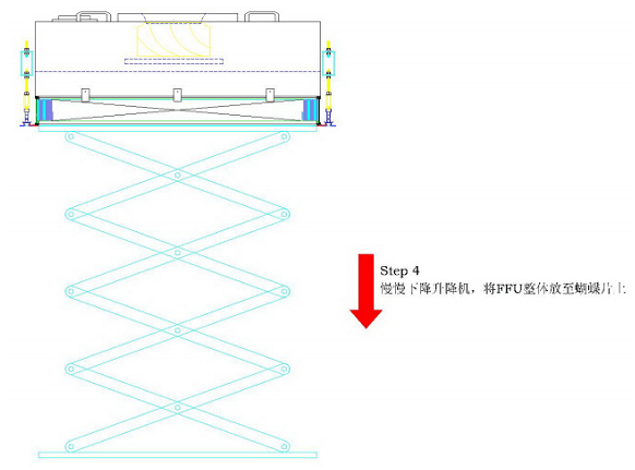 FFU安裝指導(dǎo)指南步驟5:移走升降機(jī),完成FFU箱體及高效過(guò)濾器的安裝,如下圖所示: