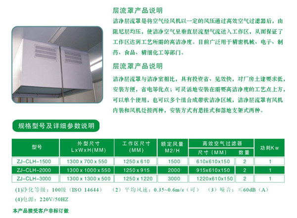 潔凈度:工作區內≥0.5μm粒徑的塵?!?.5顆/升(FS209E100級) 噪聲:≤64 Db(A) 平均風速:0.3一0.55m/s,潔凈層流罩與潔凈室相比,具有投資省,見效快,對廠房土建要求低,安裝方便,省電等優點,目前廣泛用于精密機械 、電子、制藥、食品、精細化工等部門。