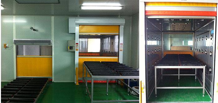 4、快速卷簾門流水線貨淋室(自動感應控制快速卷簾門),流水線可做成整體一條線,門下降時接近流水線,也可將流水線分成三部分;